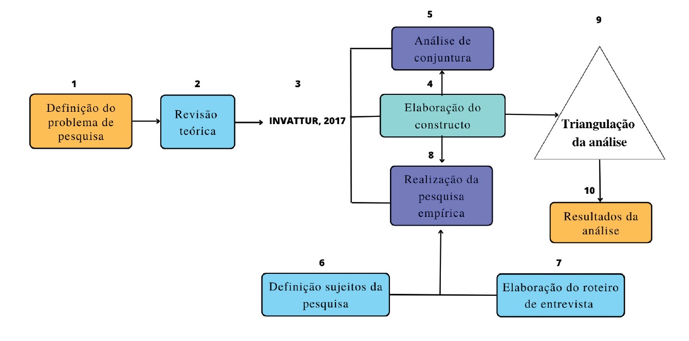 A triangulação permite ao pesquisador o uso de três ou mais técnicas de coleta e/ou fonte com o intuito de ampliar o conjunto de informações sobre determinado assunto a partir de distintos olhares, podendo, inclusive, servir para pesquisas quantitativas também, “obtendo, assim, visão de vários informantes e o emprego de uma variedade de técnicas de coleta de dados que acompanha o trabalho de investigação” (Jesus-Lopes, Maciel, & Casagranda, 2022, p. 10). Nesta pesquisa, a triangulação lançou mão de entrevistas e análise de conjuntura: documentos e sites oficiais das instâncias de governança, bem como revisão teórica. A Figura 1 apresenta um esquema que ilustra a trajetória da pesquisa.