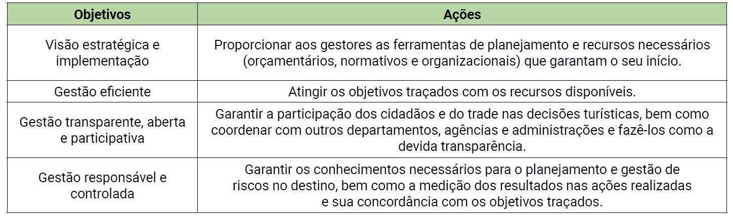Conforme observado pela UNWTO (2020), as IG devem levar em conta que a gestão de destinos exige uma gestão coordenada e conjunta de todos os elementos que compõem tal destino turístico, a qual só pode ser alcançada com uma política de diálogo contínuo e aberto e a coalizão de várias organizações e interesses em favor de um objetivo comum: garantir competitividade e sustentabilidade do destino turístico a longo prazo.