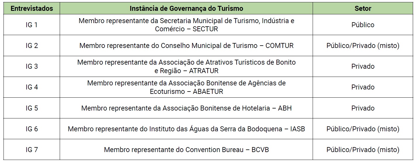 Dessa forma, as entrevistas foram realizadas com representantes de cada uma dessas instâncias de governança locais, entre maio e setembro de 2022, levaram entre 30 e 60 minutos e foram realizadas online, pela plataforma google meet. Os respondentes foram esclarecidos quanto aos propósitos da pesquisa e sua importância. Os entrevistados foram escolhidos por sua relação com as instâncias de governança turísticas locais (IG) e estão representados no Quadro 3.