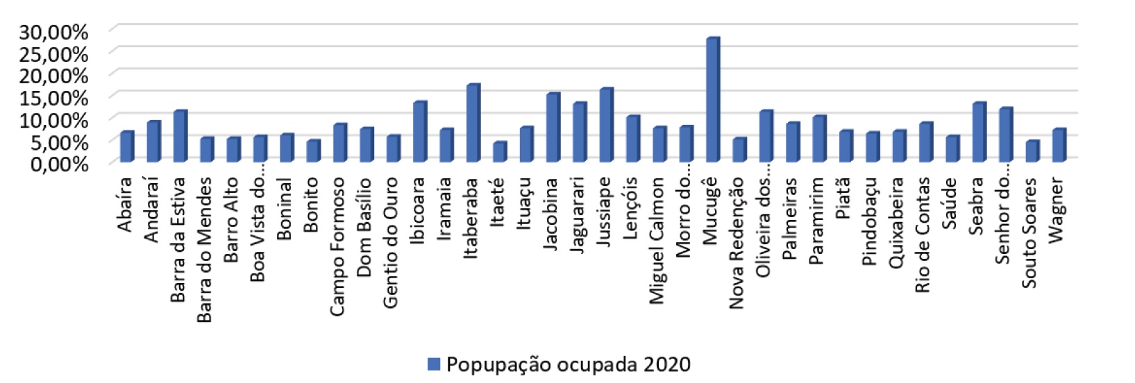 Mostrou-se interessante relacionar os indicadores do gráfico anterior (2) com uma outra base de dados, que possa compreender o cenário regional com relação ao índice de pessoas ocupadas. No Gráfico 3 que se segue é possível analisar essas porcentagens. Dessa vez, um município turístico tem destaque, como é o caso de Mucugê, um importante polo turístico da região, que detém a maior porcentagem na região de pessoas ocupadas. Mas, o município de Lençóis, a principal cidade turística da região, ainda apresenta números tímidos com relação às informações coletadas.