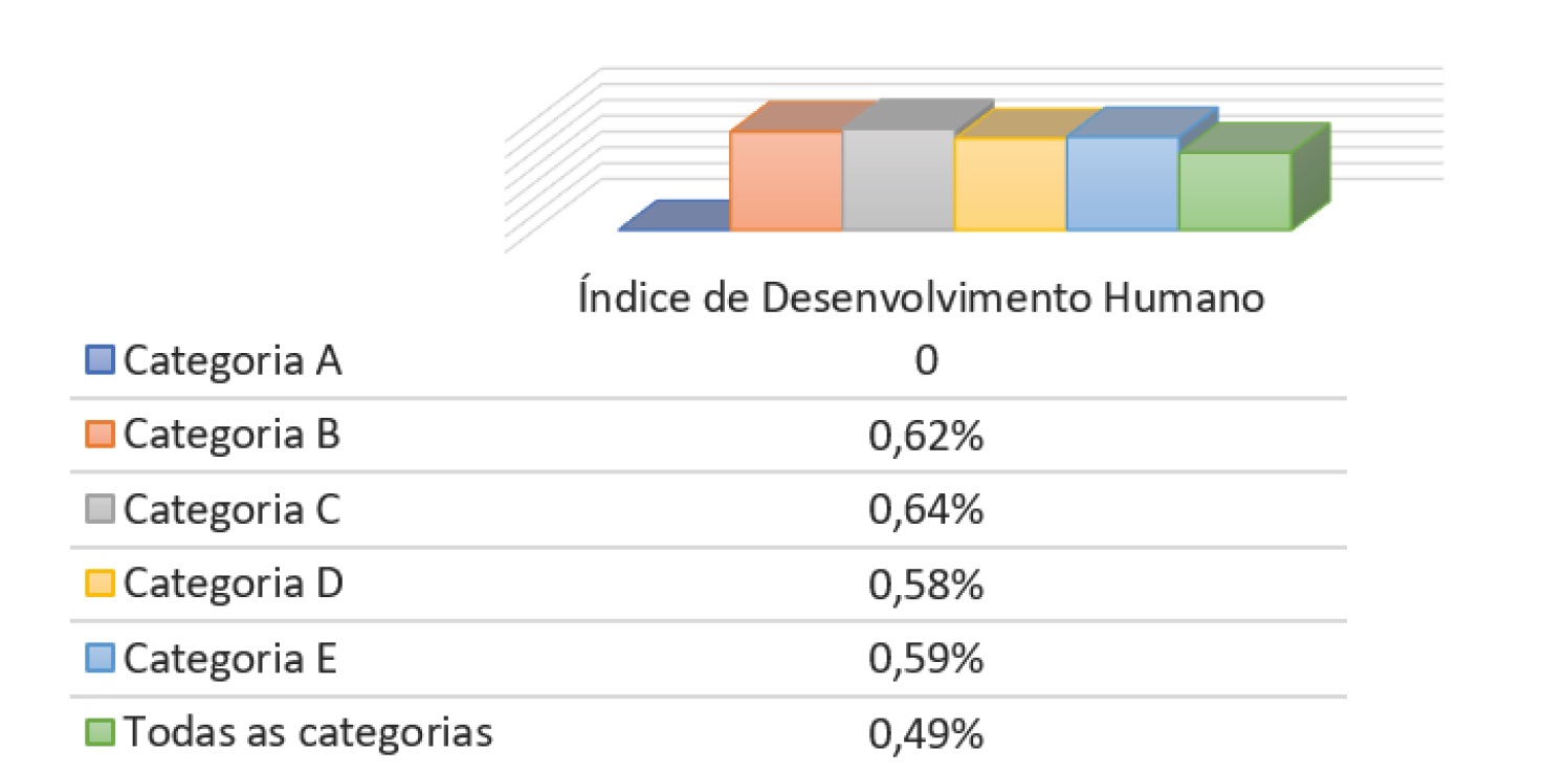 Sua escala varia de 0 (nenhum desenvolvimento humano) a 1 (desenvolvimento humano total). No Gráfico 4, é apresentado o IDH dos municípios categorizados, fruto da média ponderada dos casos estudados, no qual o índice até 0,499 significa um baixo desenvolvimento humano, como é o caso da região da Chapada Diamantina como um todo, de 0,5 até 0,799 representa um desenvolvimento médio e, quando ultrapassa 0,8, o desenvolvimento é considerado alto, índice que não é representado por nenhuma categoria.