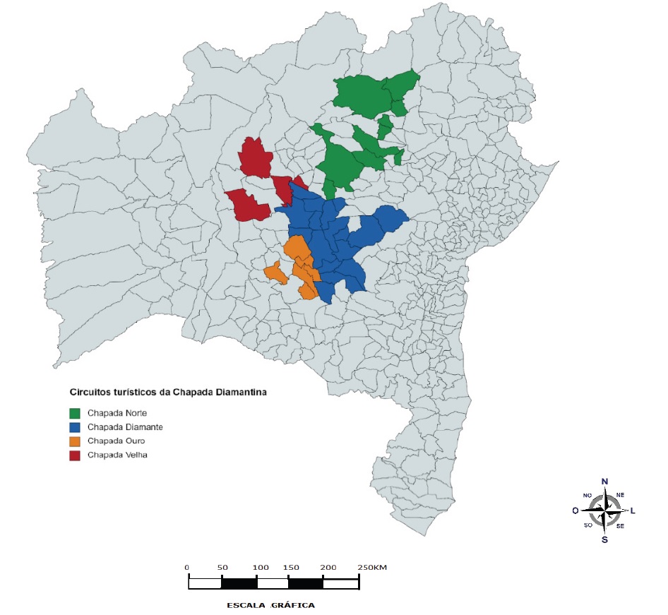 A figura 1 apresenta os circuitos da Chapada Norte (Campo Formoso, Miguel Calmon, Morro do Chapéu, Quixabeira, Pindobaçu, Senhor do Bonfim, Saúde, Bonito, Jacobina, Jaguarari); Chapada Diamante (Andaraí, Barra da Estiva, Boa Vista do Tupim, Boninal, Ibicoara, Iramaia, Iraquara, Itaberaba, Itaeté, Ituaçu, Lençóis, Mucugê, Nova Redenção, Palmeiras, Seabra, Souto Soares, Wagner); Chapada Ouro (Abaíra, Dom Basílio, Jussiape, Paramirim, Piatã, Rio de Contas); e Chapada Velha (Barro Alto, Barra do Mendes, Gentio do Ouro, Oliveira dos Brejinho).