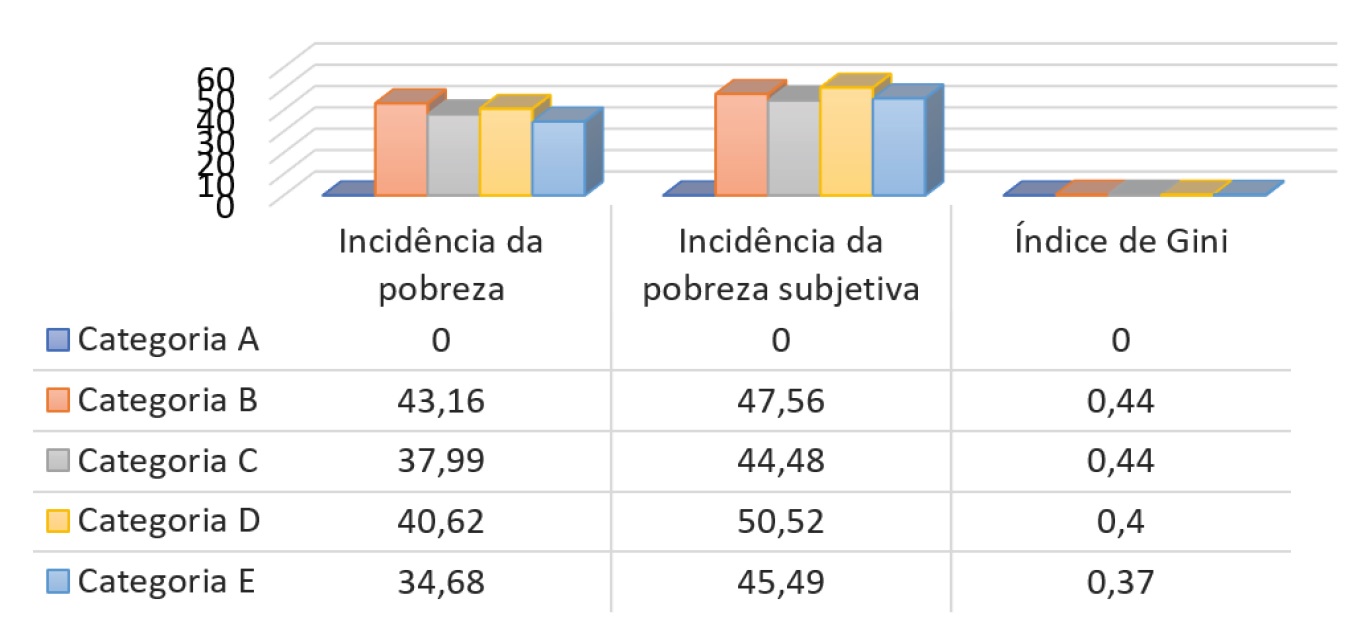 Não há indicadores quantitativos na categoria A, uma vez que inexistem municípios nessa classificação na Chapada Diamantina. Na categoria B evidenciam-se índices acentuados da incidência da pobreza, chegando a porcentagens equiparadas à linha da pobreza da região nordeste do Brasil, que em 2022 era de 44,8% (Brasil, 2022). Posteriormente, os municípios categorizados em C apresentam números mais baixos relacionados à incidência da pobreza, embora apresentem um número igual ao Índice de Gini da categoria B. Vale destacar que, essas duas categorias (B e C), são as que concentram os municípios que já desenvolvem a atividade turística de forma consolidada. Por fim, a categoria E, que representa municípios que ainda não detém uma demanda turística efetiva, mas que apresenta os melhores indicadores, tanto de incidência da pobreza quanto do Índice de Gini. Embora todas as categorias apresentem dados preocupantes do Índice de Gini, destaca-se que os números ficam abaixo da média nacional, que é de 0,544 (Brasil, 2022).