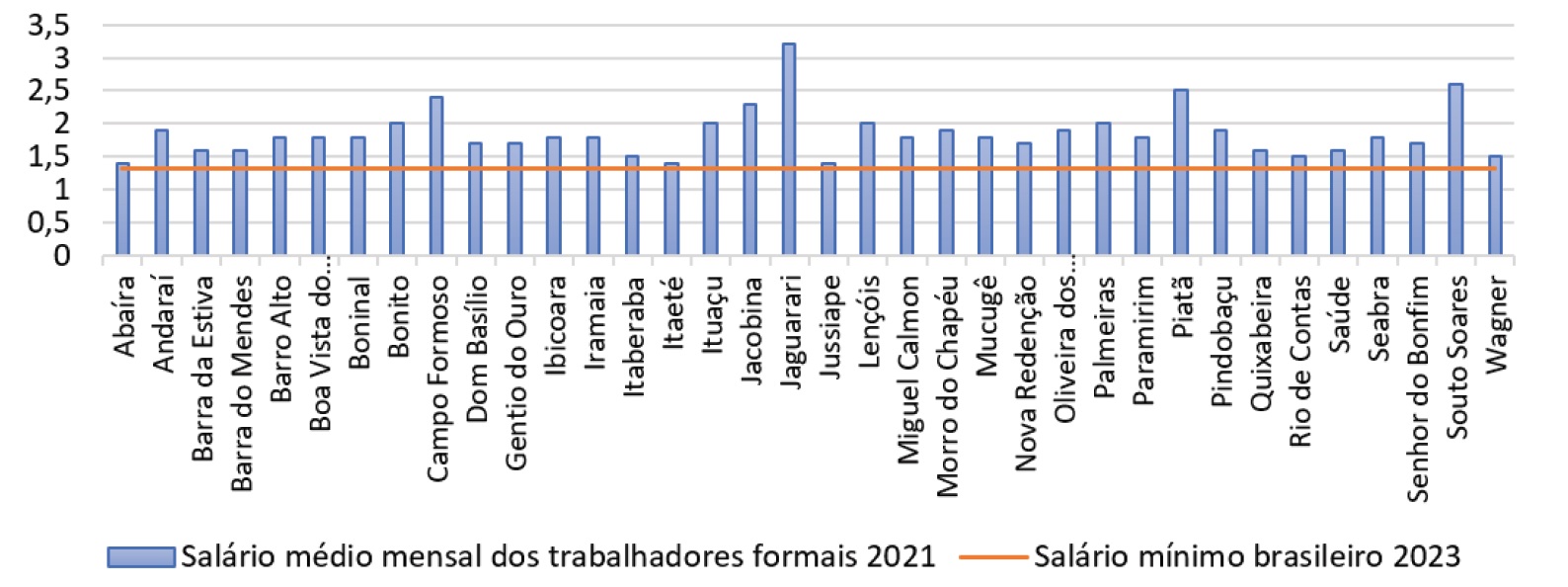 Paralelamente, observou-se a necessidade de interpor informações relacionadas ao contexto dos dados de salário médio mensal de pessoas ocupadas (2021) em comparação com o salário mínimo brasileiro de 2023, que equivale a R$1.320,00. O Gráfico 2 apresenta a média salarial dos municípios da Chapada Diamantina em comparação com o salário mínimo. É evidente notar que os municípios de Abaíra, Itaeté, Jussiape, Quixabeira e Wagner, apresentam salários próximos à média nacional, apesar de esses municípios não terem o turismo como uma das principais atividades econômicas. Já Jaguarari, Piatã e Souto Soares apresentam as melhores condições de salários, mas também não têm o turismo como fonte de renda. Já Lençóis, Mucugê e Palmeiras, que têm o turismo como uma alternativa econômica, têm seus salários em uma média equivalente aos outros municípios.