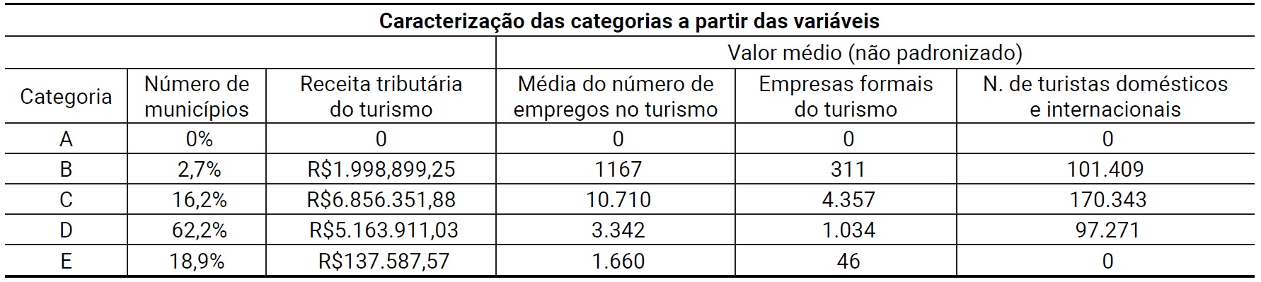 Apesar das dificuldades de medir a categorização dos municípios, as informações se fazem valiosas por serem dados oficiais do MTur, que por um lado revelam as fragilidades da política pública, e por outro possibilitam compreender a economia do turismo na região. Diante disso, adotou-se as variáveis, levando-se em consideração os dados do ano de 2022, de número de municípios categorizados (A, B, C, D e E); receita tributária do turismo; média do número de empregos no turismo; empresas formais do turismo; e número de turistas domésticos e internacionais.
