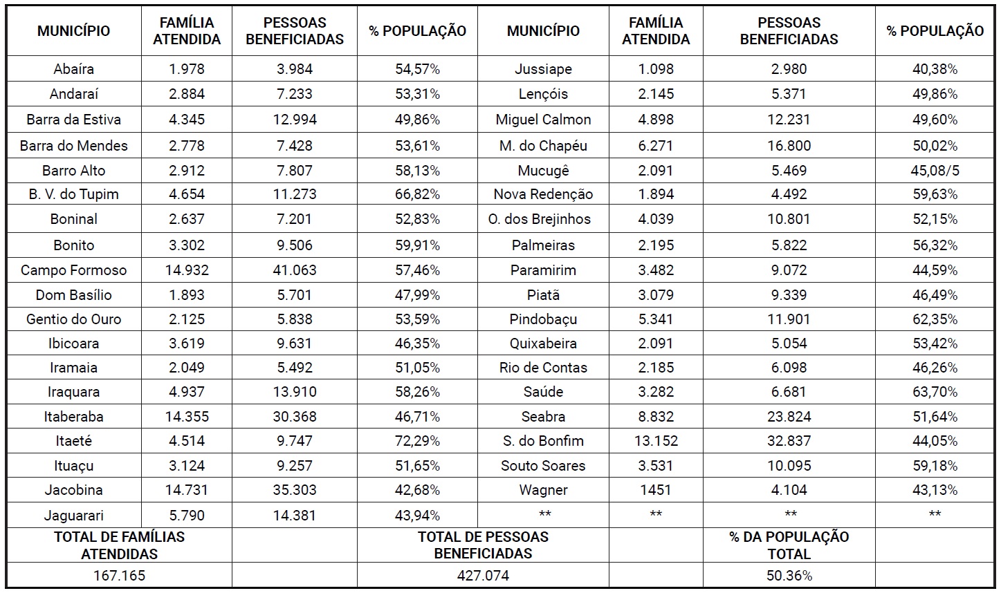 A caixa Econômica Federal pontua critérios para os beneficiários desse Programa: a principal regra é ter a renda mensal por pessoal de até R$218,00, seguindo esse principal critério, as famílias estariam aptas ao Programa. Dessa forma, percebe-se que 50,36% da população da Chapada Diamantina vive, mensalmente, com renda igual ou inferior a R$218,00. Esses dados são ainda mais alarmantes quando se foca nos índices municipais, a exemplo de Boa Vista do Tupim (66,82%), Itaeté (72,29%) e Saúde (63,70%) que apresentam os maiores indicadores de pessoas em condições de vulnerabilidade social. Já Jacobina (42,68%), Jussiape (40,38%) e Wagner (43,13%) são os municípios com as menores porcentagens de pessoas e famílias que são elegíveis ao Programa socioeconômico do Governo.