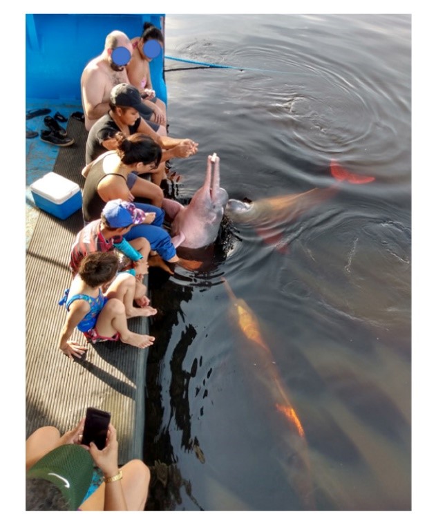 Diariamente, excetuando as segundas-feiras, são realizadas oito sessões de oferta alimentar aos botos, momentos em que os visitantes podem observar e tocar nos animais (Figura 3). Não é permitida a entrada de visitantes na água e somente os funcionários do empreendimento alimentam os botos, o que diminui o risco de acidentes envolvendo botos-visitantes (mordidas e outras lesões, transmissão de zoonoses). As interações são precedidas de palestra nas quais são repassadas aos visitantes informações sobre a biologia dos botos, crenças relacionadas a esses animais e principais ameaças à espécie. Por estar situado na área urbana de Novo Airão, sendo o acesso possível tanto pelo rio quanto por estrada, o empreendimento localiza-se próximo a potenciais fontes de impactos negativos aos botos, como elevado tráfego de embarcações e efluentes despejados na água.