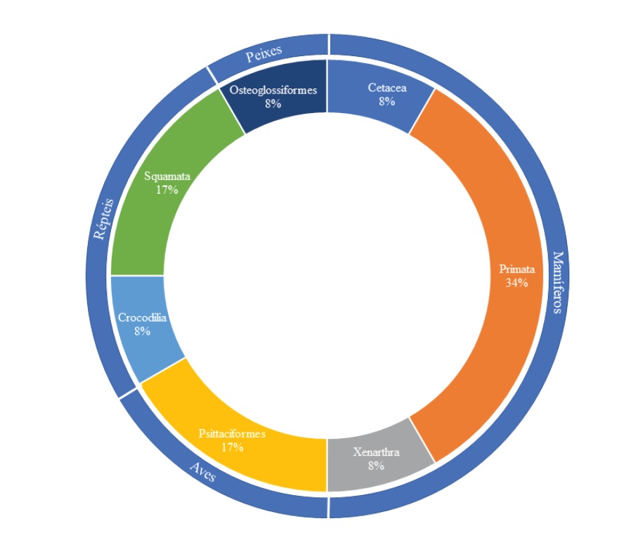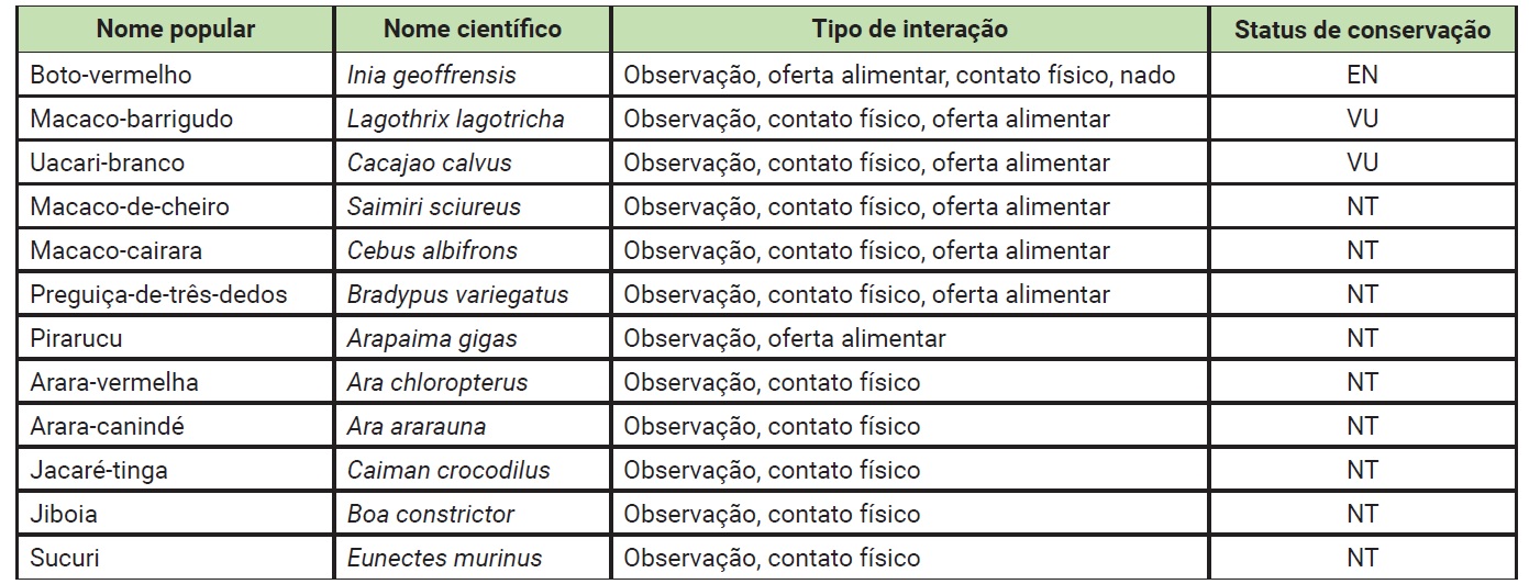 Nos sete empreendimentos visitados foram registradas interações turísticas com 12 espécies da fauna silvestre (Tabela 1), distribuídas em sete ordens pertencentes às classes dos mamíferos, aves, répteis e peixes (Figura 2). As atividades desenvolvidas pelos visitantes variam de acordo com a espécie foco e incluem a observação dos animais, oferta alimentar, contato físico (tocar ou segurar nas mãos) e entrada na água. Dentre as espécies registradas destacam-se o boto-vermelho (Inia geoffrensis), o macaco-barrigudo (Lagothrix lagotricha) e o uacari-branco (Cacajao calvus), presentes na lista vermelha de espécies ameaçadas da IUCN (da Silva et al., 2018; Stevenson et al., 2021; Aquino et al., 2022).