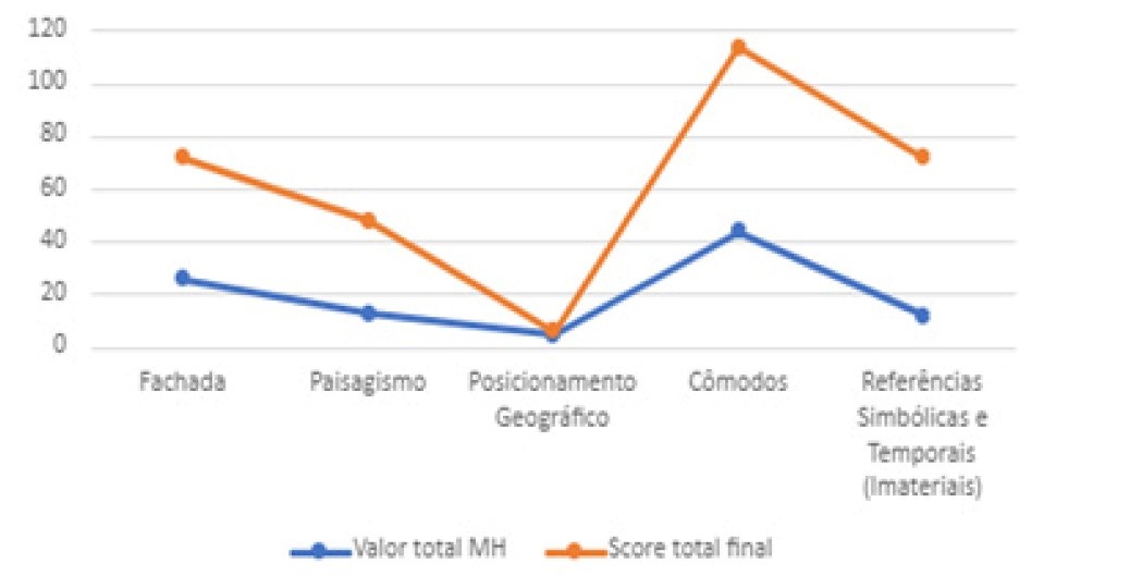 Iniciando pela análise da categoria fachada (Figura 3), na qual o máximo possível alcançado seria de 72 pontos, verifica-se que os seis equipamentos brasileiros atingiram, em conjunto, 26 pontos, indicando, uma variação total de 46. Portanto, valor considerado baixo, em virtude da importância visual da categoria para representação objetiva da paisagem analisada.