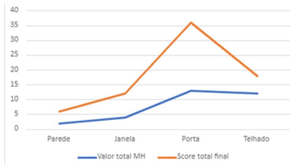 Quando se examina com maior precisão os critérios que compõem a fachada (parede, janela, porta e telhado) e conforme a figura 1, percebe-se que as principais variações ocorrem nas subcategorias porta (oscilação de 23 pontos) e janela (8 pontos de oscilação), seguido de telhado (6 pontos) e parede (4 pontos). Apesar da categoria fachada representar um componente visual fundamental na caracterização da paisagem da Toca Hobbit, somente o critério “cor amarela” da parede obteve maior aproximação com o mundo possível ficcional. Outro elemento de grande representatividade, mas que não obteve o mesmo nível de aproximação da construção paisagística original proposta por Tolkien e representada nos filmes dirigidos por Peter Jackson, foi a porta redonda, considerada um dos elementos visuais característicos da Toca Hobbit (ver figura 1). Do ponto de vista do conceito de paisagem, apesar de reconhecer sua complexidade e constituição de elementos simbólicos e imateriais, é inegável a relevância desempenhada pelos elementos de ordem material e visual. Nessa categoria “fachada”, respectivamente, os MH5, MH1 e MH6 obtiveram as maiores notas, indicando maior coesão e engajamento com o aspecto visual da toca, conforme referências originais dessa paisagem.