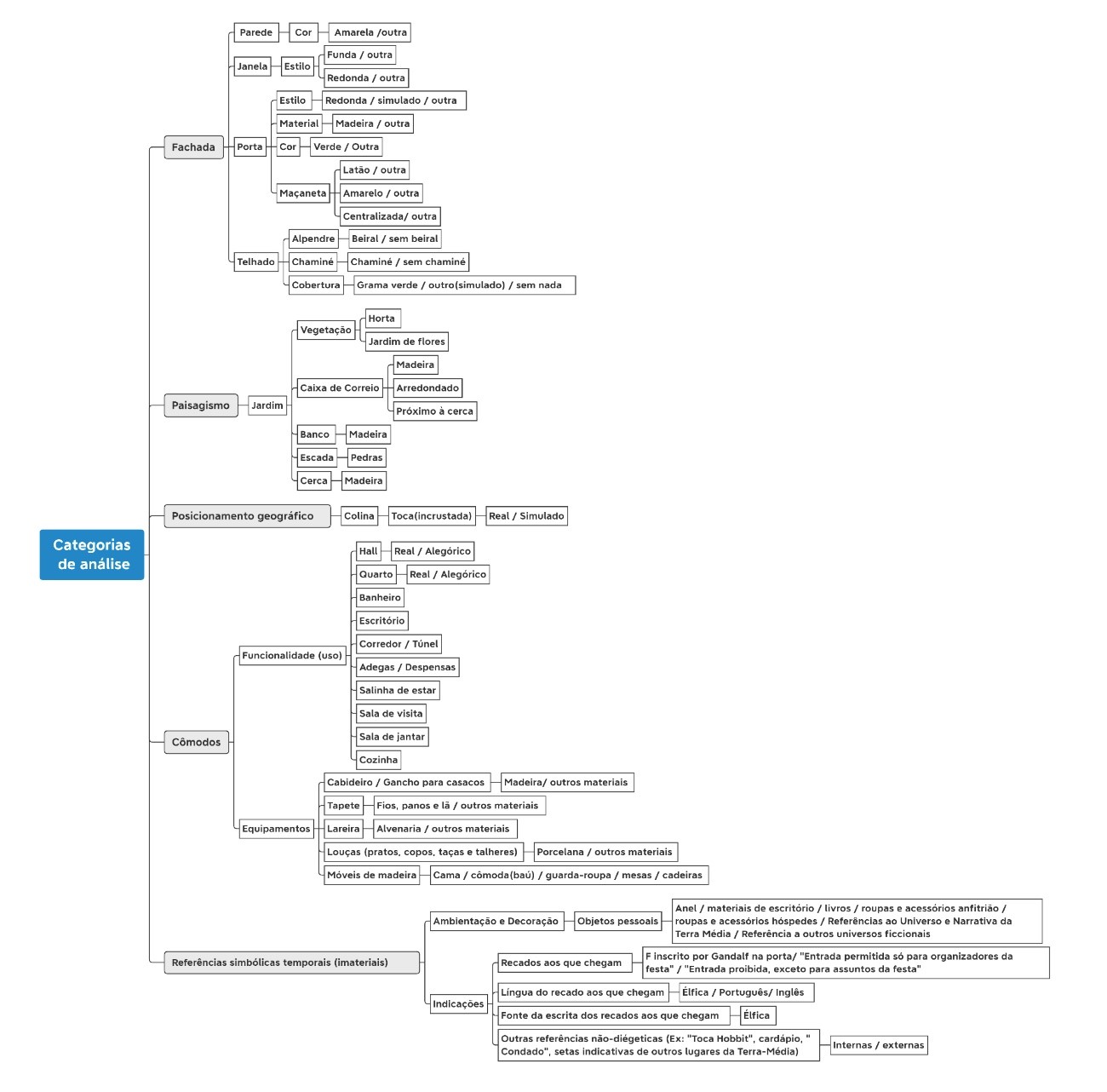 As categorias elencadas foram elaboradas considerando, inicialmente, aspectos visuais marcantes da paisagem da Toca Hobbit. Portanto, as categorias “fachada”, “paisagismo”, “posicionamento geográfico” e “cômodos” dizem respeito à caracterização sensorial que privilegia a sua constituição externa e interna em termos arquitetônicos. Contudo, e por ser também a paisagem composta por referências simbólicas e culturais, entendidas aqui como signos de alusão intra, meta e supra diegética ao universo tolkieniano, foi incorporada à categoria “referências simbólicas temporais (imateriais)” com o objetivo de abarcar esses elementos na composição cênica das hospedagens (Figura 1).