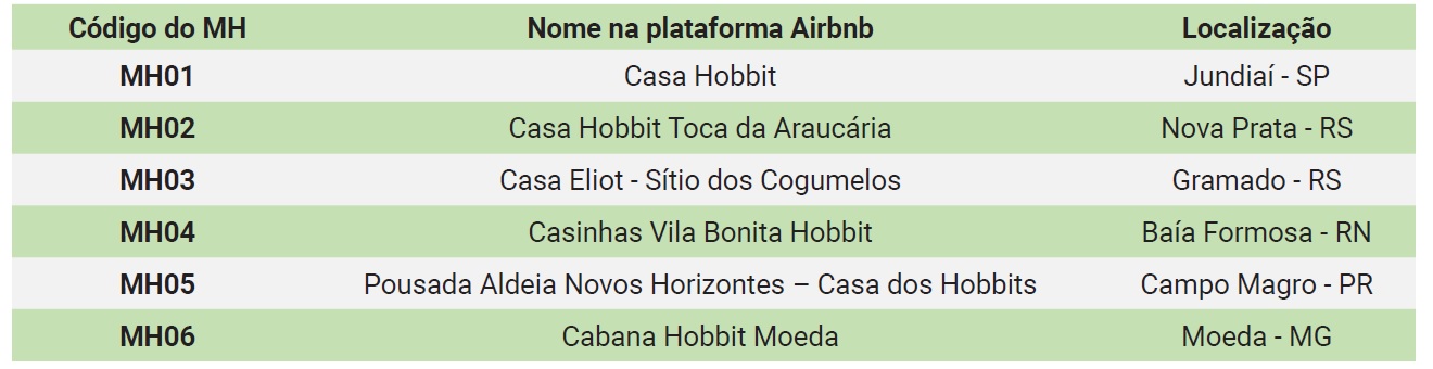 Ao optar por privilegiar o termo autoexplicativo de “toca” (tanto que a categoria “posicionamento geográfico” foi a que menos teve discrepância), o esforço de compreensão do que significa “hobbit” foi negligenciado, ainda que todas as indicações necessárias à transposição da paisagem estejam descritas verbalmente ou via audiovisual nos textos literários e cinematográficos. Há uma aparente falta de conhecimento sobre tais residências inspiradoras, e a remissão ao imaginário da “Toca Hobbit” ocorre, por vezes, a partir de um estilo pastiche e kitsch. Assim, há uma sobrevalorização do efeito promocional ao associar um nome conhecido a um meio de hospedagem que, no final, não entrega a experiência que sugere. Vale perceber que os seis meios de hospedagem analisados (quadro 1) utilizam em suas nomenclaturas termos como “casa”, “casinha”, “cabana”. Embora o epíteto “toca” não esteja verbalmente inscrito, é inegável que é a este termo que todos estão remetendo. A indicação latente do imaginário “toca” é comprovada quando se verifica que cinco dos seis MH optaram por incrustar suas unidades habitacionais, algo que não faria sentido se este termo não estivesse espectralmente presente quando da decisão de implementação da estratégia de construção.