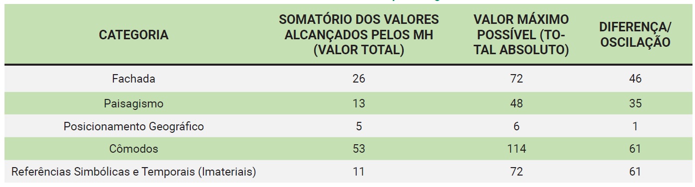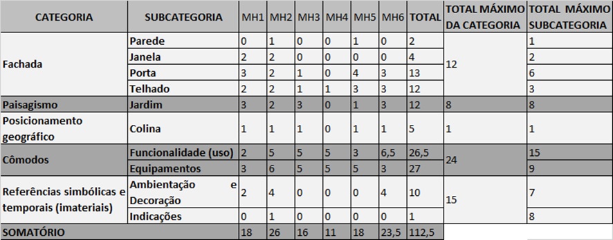Já no que tange ao âmbito comparativo entre os seis meios de hospedagem, pode-se constituir a seguinte ordem crescente de aproximação da paisagem concreta com aquela ficcional: MH2 (26 pontos de discrepância), MH1 (33 pontos de discrepância), MH5 (34 pontos de discrepância), MH6 (35 pontos de discrepância), MH3 (36 pontos de discrepância) e MH4 (41 pontos de discrepância). Tais valores foram obtidos a partir da subtração do total máximo possível de ser adquirido por cada meio de hospedagem (52 pontos) e o valor, de fato, conquistado por cada meio de hospedagem foi, respectivamente: MH1 (19 pontos), MH2 (26 pontos), MH3 (16 pontos), MH4 (11 pontos), MH5 (18 pontos) e MH6 (17 pontos). Na Tabela 1 é demonstrado a comparação por categoria/subcategoria para os MH analisados.