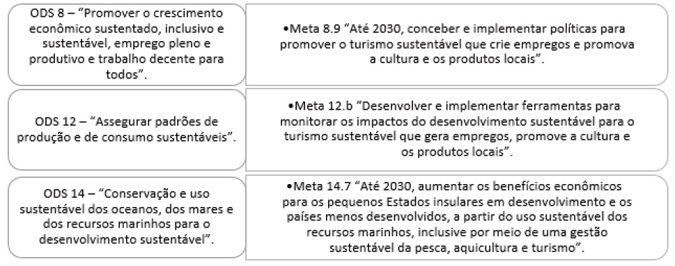 De acordo com a OMT (2019, tradução: Ministério do Turismo, 2019), o turismo sustentável “tem o potencial de contribuir, direta ou indiretamente, para todos os objetivos. Em particular, foi incluído como meta nos Objetivos 8, 12 e 14”, os quais estão expostos na Figura 1.
