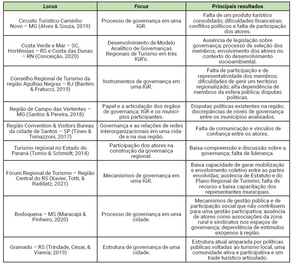 No contexto brasileiro, a literatura sobre governança no turismo apresenta, sobretudo, estudos de caso que avaliam a estrutura e a atuação da governança em instâncias regionais (Alves & Souza, 2019; Bantim & Fratucci, 2019; Conceição, 2020; Xavier, Totti, & Raddatz, 2021) e municipais (Trindade, César, & Vianna, 2019; Maracajá & Pinheiro, 2020). São relatadas experiências em que se identifica uma forte articulação e cooperação dos atores locais no planejamento e na gestão (Trindade, César, & Vianna, 2019), bem como casos em que os desafios institucionais e organizacionais ficam evidentes (Coutinho & Nobrega, 2019), como problemas de comunicação, de integração e de articulação entre os diversos atores (Barbara, Leitão, & Fontes Filho, 2007).