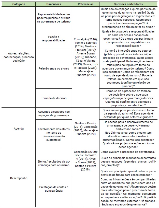 A coleta de dados, tanto por meio da entrevista quanto da pesquisa documental, foi norteada por três grandes categorias e oito dimensões de análise, estruturadas a partir do diálogo com pesquisas anteriores. O Quadro 2 detalha cada categoria, expondo as dimensões, referências e questões norteadoras.