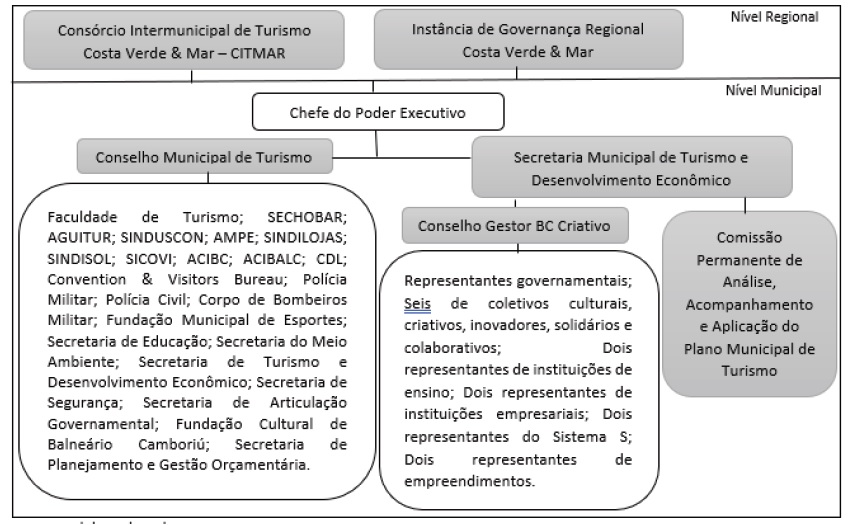 A governança em nível municipal é formada pelo COMTUR, pela Sectur, pelo Conselho Gestor BC Criativo e pela Comissão Permanente de Análise, Acompanhamento e Aplicação do Plano Municipal do Turismo (PMT).