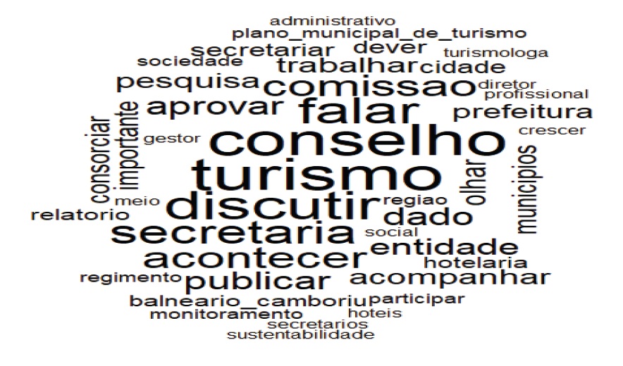 A nuvem de palavras criada a partir da entrevista, utilizando o Iramuteq, evidencia a centralidade do conselho, das comissões e da secretaria, apontando para diferentes instâncias (municipal e regional), diferentes atores (hotelaria, lideranças políticas, técnicos e sociedade) e instrumentos (regimento, relatório, plano).