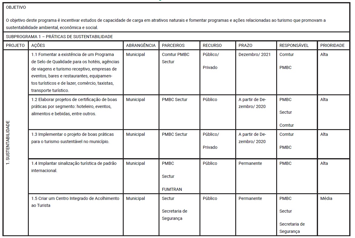 São quatro os programas definidos no PMT: Qualificação Profissional, dos Serviços e da Produção Associada; Empreendedorismo e Políticas Públicas do Turismo; Informação ao Turista, Promoção e Divulgação do Destino Turístico; e Sustentabilidade. O PMT é sucinto na exposição dessas ações e o Quadro 3 apresenta todo o programa que trata da sustentabilidade.