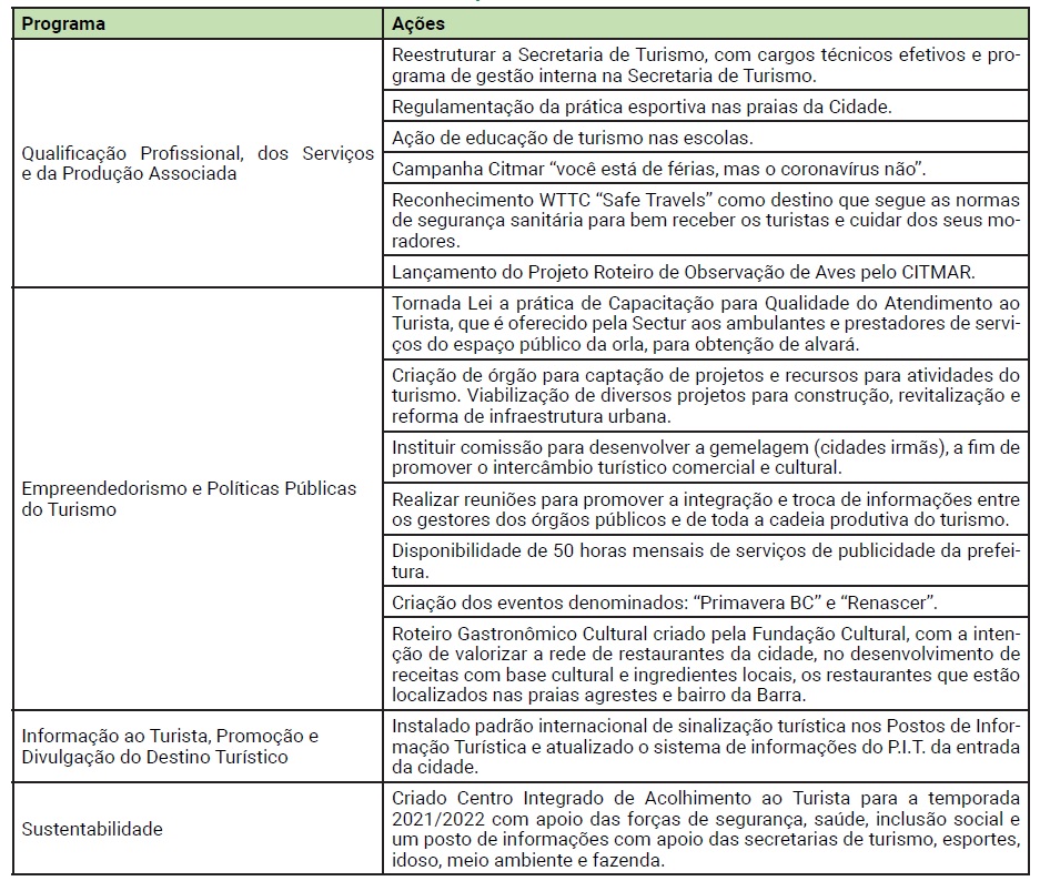 O desempenho gerado com a estrutura de governança presente no município de Balneário Camboriú pode ser evidenciado pela avaliação das ações elencadas no PMT. A prestação de contas sobre estas ações passou a ser realizada por meio da Comissão formada pelas turismólogas do município. A partir de então, as ações começaram a ser formalmente monitoradas e acompanhadas. O Quadro 4, a seguir, apresenta as ações alcançadas e seu respectivo Programa.