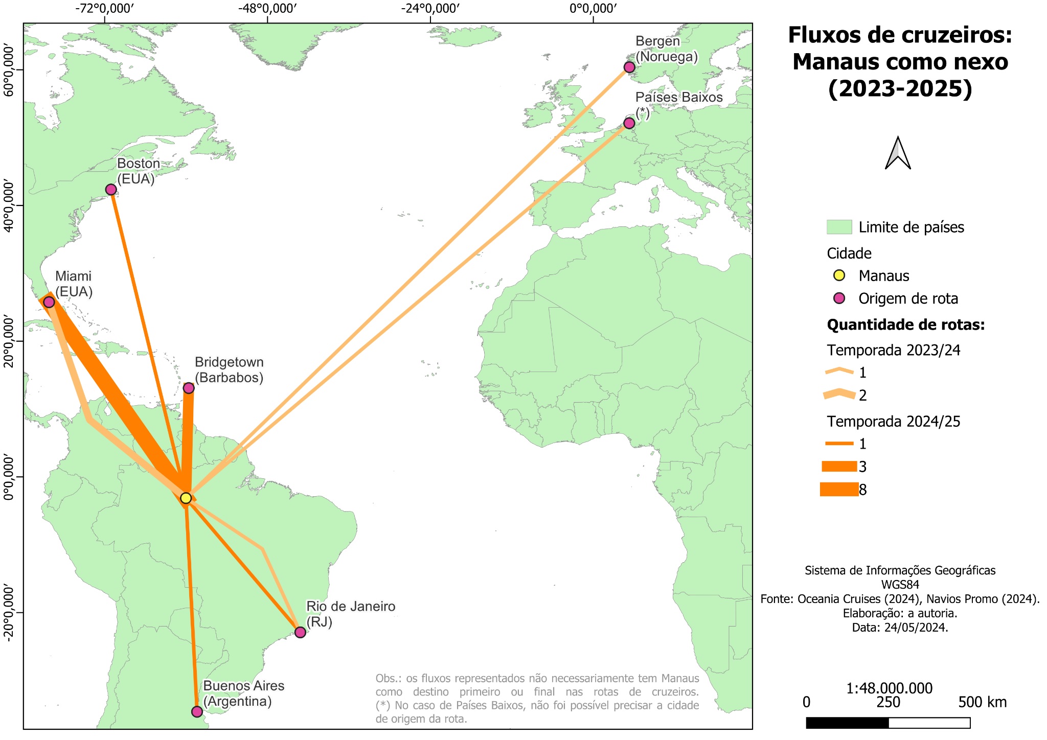 O mapa acima demonstra a capilaridade da rede de cruzeiros que tem Manaus como nexo, em parte, também apresenta a exterioridade desta metrópole no sistema global. Outro fato que chama atenção é a disparidade nesse recorte da rede urbana global, pois Manaus, uma cidade do antigo terceiro mundo, é, a partir das rotas levantadas nesta pesquisa, um nexo a ser explorado, sob mediação das firmas, pelos consumidores oriundos principalmente dos países centrais. Comenta-se ainda que, no recorte temporal considerado (2023-2025), das 19 rotas, 11 delas são oriundas dos Estados Unidos (EUA), 10 destas somente de Miami (Flórida), fazendo com que esta cidade seja o principal nexo de origem de rota em articulação com Manaus no sistema.