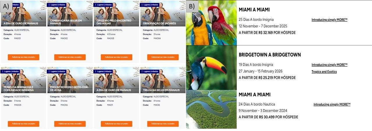 Em função de trazer à tela elementos para materializar a circulação de cruzeiros, extraiu-se dados em sites de empresas de venda de passagens durante o mês de abril de 2024, centrando-se em algumas variáveis: as rotas, onde se evidencia o ponto de partida, ponto final e a intersecção com a cidade de Manaus; em complemento, destaca-se alguns elementos, como as imagens e os discursos contidos nos enunciados utilizados pelas empresas de transporte/turismo para estimular a venda das rotas relativas à Manaus (Oceania Cruises, 2024; Navios Promo, 2024).