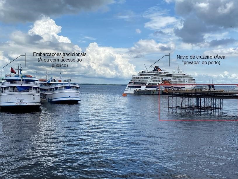 Uma dinâmica interessante a ser destacada é que, apesar das embarcações tradicionais e os navios de cruzeiros dividirem a continuidade dessa porção da orla da cidade de Manaus, somente a porção mais ocidental, onde ancoram os navios é considerada como “Porto de Manaus” que, diferente das embarcações convencionais que estão no “porto da Manaus Moderna”.