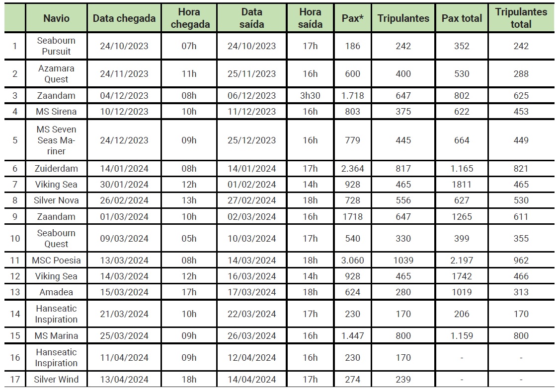 A temporada de cruzeiros na cidade de Manaus inicia no mês de outubro de um ano e finaliza no mês de maio do ano seguinte (Agência Amazonas, 2023). A temporada de 2023/2024, que se sucedeu durante o andamento desta pesquisa, contou com a chegada de 17 navios que compreendem não só a cidade de Manaus como destino, mas também Parintins, ambas na porção leste do Amazonas (Tabela 01). A temporada de cruzeiros em Manaus se relaciona com o regime hidrológico da Amazônia, pois se dá no período de enchente dos rios, fato que pode ser importante para viabilizar a circulação de navios de grande porte como normalmente são os de cruzeiro.
