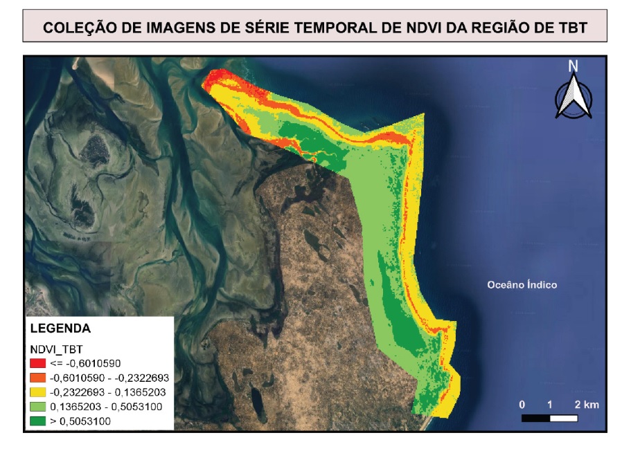 Os autores consubstanciaram igualmente os dados de NDVI com duas imagens temporais por si extraídas entre 2015 e 2021. Uma imagem do Centro de Desenvolvimento Sustentável para Zonas Costeiras (2008), evidenciando a evasão das águas do mar, decorrente da destruição das dunas primárias de proteção costeira, é ilustrada. Por último, baseando-se em dados da Climate Central para 2050, a pesquisa perspectivou potenciais consequências na dialética entre alteração na dinâmica do uso da terra e evasão das águas do mar.