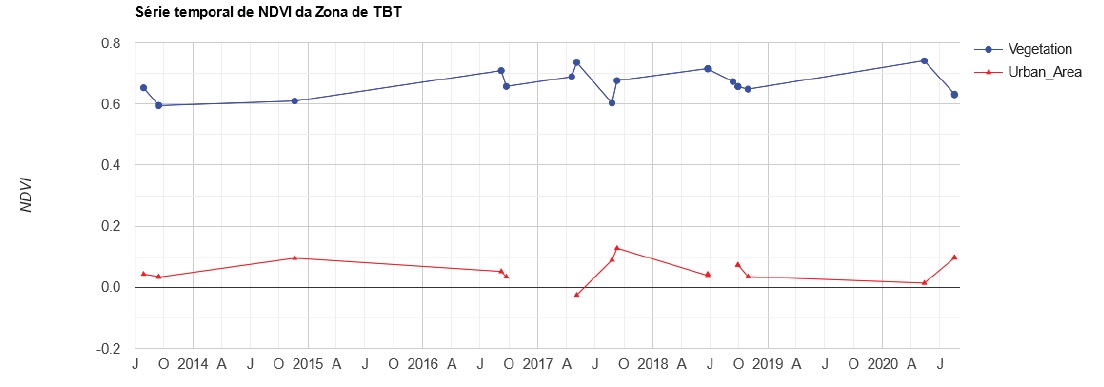 Por outro lado, a análise da alteração da dinâmica do uso da terra baseou-se no indicador NDVI. Importa referir que a análise da alteração da dinâmica do uso da terra, baseia-se nos pressupostos teóricos de turistificação, que em certos casos, resulta no processo de desflorestamento para a construção de infraestrutura específica e de apoio ao desenvolvimento do turismo. Para tal, se recorreu a coleção de imagens de Landsat 8(ee.ImageCollection("LANDSAT/LC08/C02/T1_L2), para uma série temporal entre os períodos que mediam 1º de janeiro de 2013 e 31 de dezembro de 2023 (dez anos). O recorte temporal de dez anos decorre do fato das imagens de Landsat 8 estarem somente disponíveis desde o ano 2013, na plataforma Google Earth Engine. Foram identificadas 19 imagens e oito elementos (sete Bandas SR e NDVI). O NDVI foi calculado usando a fórmula (Banda NIR-Banda Red)/(Banda NIR+Banda Red) (Rouse et al., 1973), usando o percentual de nuvens de 10%, na plataforma Google Earth Engine. O NDVI calculado foi representado em gráfico e imagem (reproduzido no QGIS como uma camada raster). A linha vermelha (Urban area) no gráfico representa as áreas que sofreram mais alterações no uso da terra, enquanto que a linha azul (Vegetation) faz referência a áreas menos devastadas, no período analisado. Relativamente à imagem, o NDVI é representado com palete de cores (de verde a vermelho) que variam de -1 a 1. Os valores próximos a 1 representam áreas cuja a sua cobertura vegetal foi pouco alterada, enquanto que os valores distantes a 1 representam áreas com mais índices de alteração vegetal.