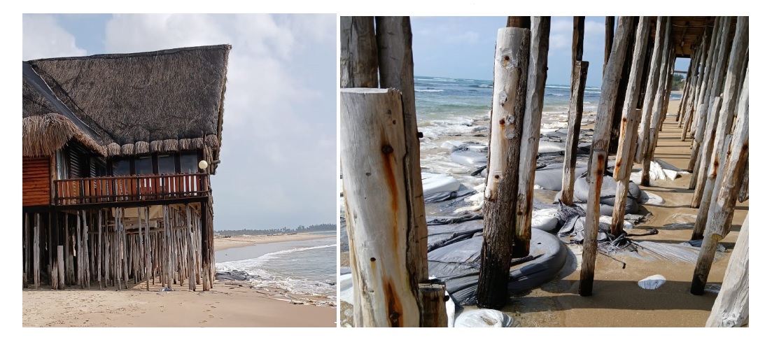 Como corolário disso, e em resultados da subida do nível médio das águas do mar, tem havido registros de uma tendência cada vez mais crescente nos últimos anos de evasão das águas do mar, decorrente fundamentalmente da destruição das dunas primárias e das vias naturais de escoamento das águas (Lee & Hsieh, 2016; Wu & Tsai, 2016). Essa situação coloca em perigo a sustentabilidade do “negócio” da atividade turística e a vida da comunidade local. Como ilustra a figura 6, vários empreendimentos turísticos distribuídos ao longo da costa, encontram-se em risco de desaparecimento. As imagens evidenciam que o processo de adaptação incremental (IPCC, 2014) que vem sendo adotado para reduzir os impactos climáticos (subida do nível do mar, fundamentalmente), traduzidos através de colocação de barreiras de sacos de areias e pedras, não tem sido suficiente para mudar o cenário atual. Isso evidencia que parte substancial da abordagem de adaptação da região, centra-se numa dimensão reativa ou orientada por eventos climáticos, em vez de mudanças climáticas a longo prazo (Mimura et al., 2015).