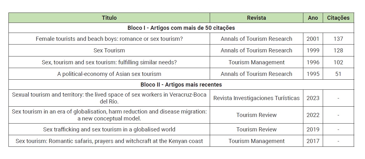 Justifica-se a seleção dos textos com mais de 50 citações por sua relevância e impacto na área de estudo, assegurando a seleção de pesquisas já reconhecidas por outros pares. O critério que seleciona os textos mais recentes garante que a análise se baseie em discussões mais atuais do campo de estudo. Já sobre o critério que seleciona somente textos produzidos em revistas especializadas em turismo, aplicado para ambos os blocos (os mais citados e os mais recentes), garante que a amostra seja relevante e estabeleça conexão direta com a área e o tema estudado.