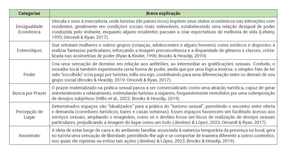 Destaca-se a identificação das principais categorias de análise, as quais apresentam regularidade nos textos examinados. Formalizando uma caracterização da prática do turismo sexual sob a perspectiva analítica dos respectivos autores, permitindo, na sequência, o cruzamento dessas categorias em busca de conexões.