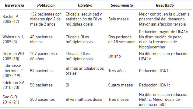 El uso en diabetes tipo 2 se fundamenta en una liberación más fisiológica de insulina, la prevención del fenómeno de alba y poder alcanzar metas disminuyendo la incidencia de hipo e hiperglucemias. Adicionalmente, existe evidencia de reducción de glucotoxicidad, lo cual mejora la resistencia a la insulina y el funcionamiento de las células beta. Además, en algunos estudios se ha demostrado el uso de menor dosis de insulina en pacientes con altos requerimientos, permitiendo a su vez la disminución del peso 15,16.