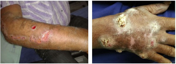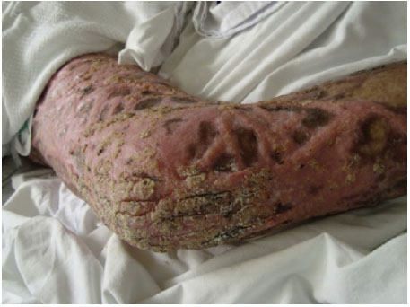 El compromiso más común es en las piernas (85 %), seguido por las extremidades superiores (predominantemente en el dorso de la mano); aunque también puede afectar otras áreas expuestas al trauma como: brazos, tronco, cuello, antebrazos, cara y glúteos 37,39. La afección diseminada, tanto en brazos como en piernas, no es común, viéndose en menos del 20 % de los casos 36,43.