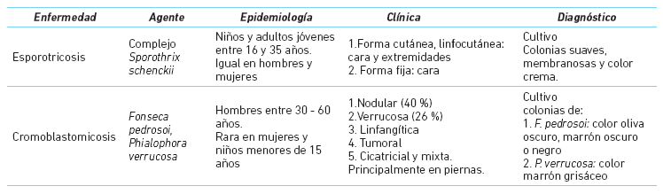 Las infecciones micóticas incluyen un amplio grupo que van desde entidades superficiales hasta infecciones profundas asociadas a planos más profundos, que incluso llegan a comprometer estructuras óseas o diseminarse y producir enfermedad sistémica. Dentro de las micosis subcutáneas más importantes en nuestro medio están la esporotricosis y la cromoblastomicosis; las menos frecuentes son micetoma, quistes faeomicóticos, lacaziosis y zigomicosis subcutánea. Los microrganismos causantes se inoculan en la piel luego de un trauma con material vegetal contaminado con el hongo y por esto también han sido llamadas micosis de implantación 1,2.