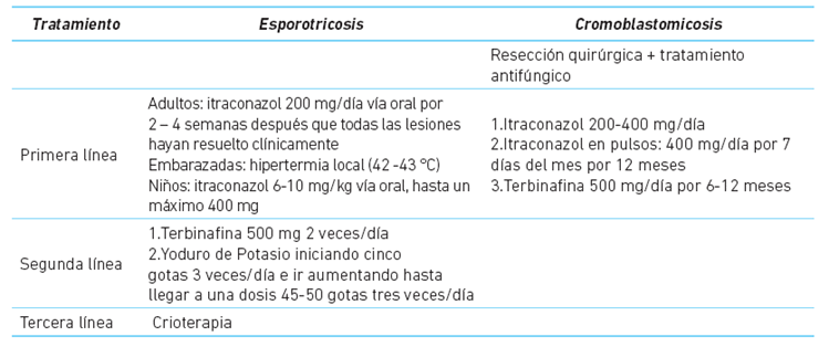 La guía realizada por la Sociedad de Enfermedades Infecciosas de América publicada en el 2007, sugiere que es necesario realizar un tratamiento a la mayoría de los pacientes, ya que es rara la resolución espontánea. En cuanto a la esporotricosis linfocutánea y fija, se recomienda (cuadro 2) 29: