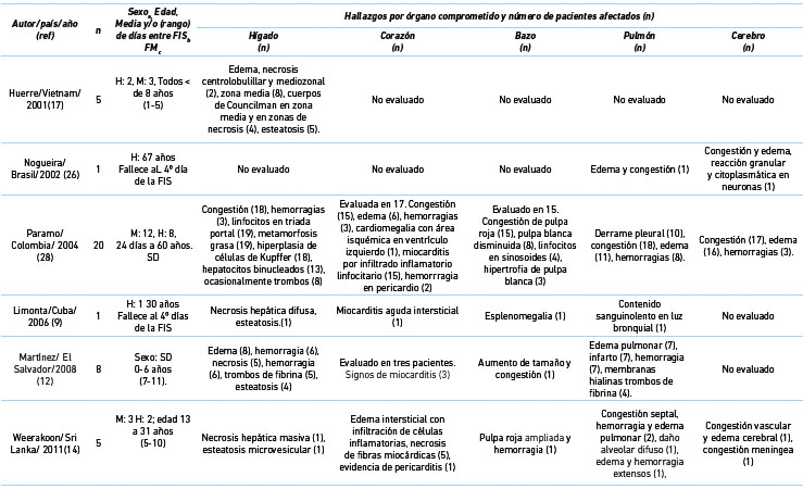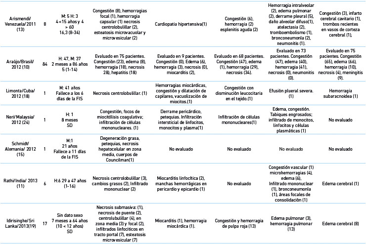 Con el objetivo de obtener una aproximación al entendimiento de la fisiopatología de la infección por el virus del dengue se hizo la revisión de 21 artículos que evaluaron 215 casos de pacientes fallecidos durante la infección por dengue y que tuvieron estudio morfológico e histológico postmorten. La revisión consideró artículos disponibles en Pubmed y Scielo. Las palabras clave utilizadas para la búsqueda fueron dengue, authopsy and death. Se excluyeron los artículos que describían pacientes con co-infecciones.