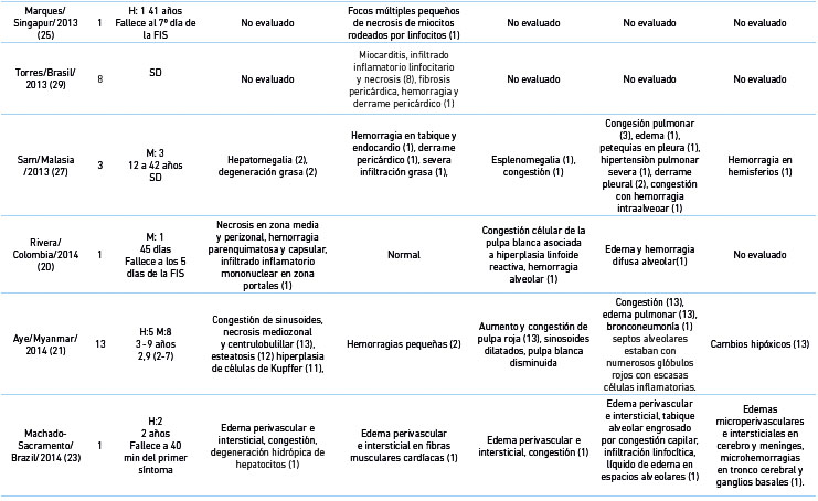 En 17 de los estudios se reporta algún tipo de compromiso pulmonar: edema, efusión pleural, atelectasias y hemorragias intra-alveolares o pleurales 9-14,16,19-24,26-29. Se describe alvéolos con histiocitos, engrosamiento del tabique, infiltrado inflamatorio mononuclear e hiperplasia de macrófagos alveolares 11,14,22-24. En macrófagos alveolares, neumocitos tipo II y endotelio se observa presencia de la proteína NS3 22.