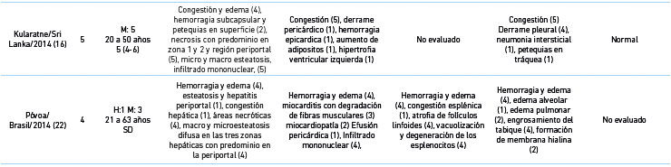 En 18 artículos se realizó descripción de alteraciones hepáticas y están presentes en todos los menores de seis años. Los hallazgos macro y microscópicos más comunes son congestión, hemorragia capsular y necrosis centrolobulillar focal. La necrosis predomina en la zona 1,2 y en región periportal 9-22. Se observa micro y macroesteatosis 9,11-17,19,21,22. Aye et al.21 encuentran en las áreas esteatósicas hepatocitos agrandados con citoplasmas vacuolares, células anucleadas, que comúnmente se acompañan de cuerpos de Councilman. Povoa et al. 22 identifican la proteína viral NS3 en células de Kupffer, células endoteliales sinusoidales del hígado, hepatocitos necróticos y en los cuerpos de Councilman, indicando replicación viral. Aye et al. 21 identifican infección en hepatocitos y células de Kuffer y el complemento neoC9, como parte del complejo de ataque en áreas de necrosis. Otros autores han observado antígeno viral en celulas de Kuffer, hepatocitos y células endoteliales de hígado 30.