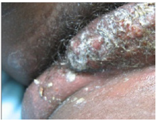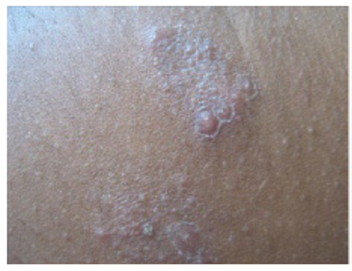 Se trataba de una paciente de 14 años quien consultó a un hospital local por un cuadro de un mes de evolución que consistía en pápulas eritematosas, vesículas y pústulas en la piel del abdomen, del cual se hizo un diagnóstico inicial de eccema y se ordenaron esteroides tópicos. Posteriormente, las lesiones se extendieron hacia la vulva y región inguinal izquierda, por lo que fue remitida a un hospital de la ciudad.