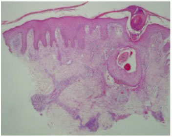 El hemograma, serología, Elisa para VIH, test de Tzanck, ANA’s y KOH, fueron negativos. Se tomó biopsia de de las lesiones del abdomen y de la vulva para pruebas con hematoxicilina y eosina (H-E) y para cultivo, mientras la paciente era tratada con oxacilina con mejoría parcial.