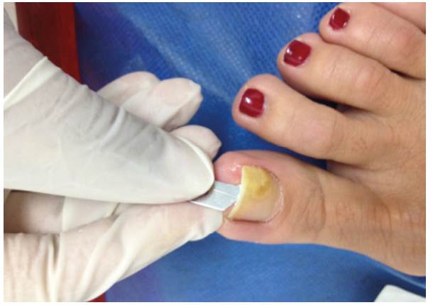 En las onicomicosis depende del sitio en donde se encuentra la lesión: si es en el borde distal y lateral subungueal debe tomarse del material subungueal y de la zona más proximal de la lámina ungueal que, aunque es una zona de difícil obtención de la muestra, es la más fiable por la menor probabilidad de contaminación y además presenta elementos fúngicos viables (figura 1).