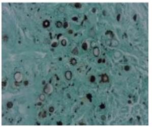 Las tinciones de rutina para realizar la histopatología son la hematoxilina- eosina, junto con el PAS y el Grocott o plata metenamina, que constituyen las tinciones básicas para el estudio de las micosis. Hay también tinciones opcionales como la de Fontana-Masson para el estudio de pigmento melánico, importante en las feohifomicosis y las tinciones para mucipolisacáridos, como la de mucicarmin, básicas para el estudio de Cryptococcus spp y otros hongos que en su pared o cápsula contengan glucoproteínas (figura 4 y 5).