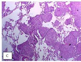 Antes de confirmar la sospecha clínica de sarcoidosis se decidió tomar biopsia de las adenopatías peri-bronquiales, la que reportó múltiples nódulos a nivel pulmonar de diferente tamaño, algunos alcanzaron hasta 3 mm, con gran cantidad de células epiteliares y células gigantes multinucleadas, sin linfocitos ni necrosis de caseificación (foto 3).