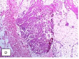 Debido a la presencia de alteración renal se sospechó compromiso renal de la sarcoi-dosis vs amiloidosis secundaria. Se tomó entonces biopsia de grasa parda abdominal y se realizó tinciones con rojo Congo y hematoxilina - eosina, que evidenciaron material amiloideo (foto 4), configurando así el diagnóstico definitivo de sarcoidosis y amiloidosis reactivas, por lo que se decidió iniciar manejo con cloroquina, presentando adecuada evolución, mejoría de sus síntomas y de la hipercalcemia.