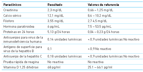 Al examen físico se encontró hepato-esplenomegalia y adenopatías bilaterales en cadenas cervicales, axilares e inguinales. En los exámenes paraclínicos se encontró una función renal alterada con tasa de filtración glomerular disminuida (33 mL/ min/1,73 m2) asociado a hipercalcemia (calcio sérico 12,1 mg/dL), hipercalciuria, nefrolitiasis bilateral, ureterolitiasis derecha, valores disminuidos de hormona para tiroidea y proteinuria en rango nefrótico (cuadro 1).