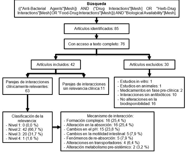 Se realizó una búsqueda en PubMed/MedLine y Embase de artículos publicados en inglés y español, con acceso a texto completo, sin límite de fecha y realizados en humanos, utilizando los términos MeSH: "Anti-Bacterial Agents" AND "Drug Interactions" OR "Herb-Drug Interactions" OR "Food-Drug Interactions" AND "Biological Availability". Se incluyeron los artículos con información de interacciones con cambios en la absorción de antibióticos. Fueron excluidos artículos: a) con métodos in vitro o en animales; b) con información de medicamentos en fase experimental; c) con información de interacciones sin cambios en la biodisponibilidad. La búsqueda se complementó con artículos valorados como relevantes y referenciados en los artículos identificados.