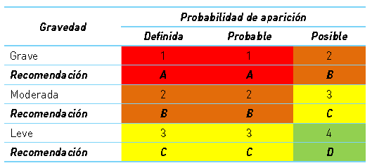 A partir de las combinaciones posibles de gravedad y probabilidad de aparición, las interacciones pueden agruparse en cuatro categorías de riesgo: