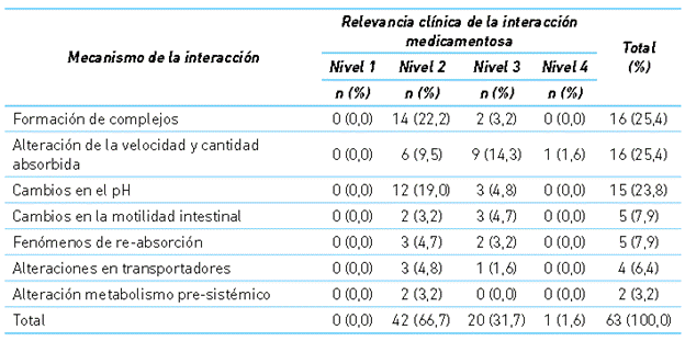 Entre las interacciones identificadas, las de nivel 2 representaron la mayor proporción (67 %). Sin embargo, independientemente del mecanismo identificado, las principales variables implicadas con cambios en la biodisponibilidad son la variación en la velocidad o en la cantidad absorbida.